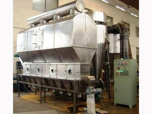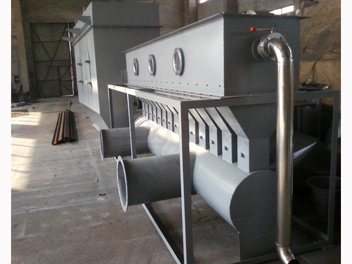 洁净的热风经阀板分配进入床体内,从加料器进入的湿物料被热风形成沸腾状态,由于热风与物料广泛接触,增强了传热传质的过程,因此在较短时间内就可干燥。从床体一头进入,经过几十秒至几分钟沸腾干燥,自动从床体另一头流出,本设备一般进行负压操作。