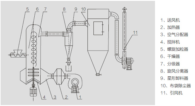 热空气由入口管以适宜的喷动速度从干燥机底部进入搅拌粉碎干燥室,对物料产生强烈的剪切、吹拂、旋转作用,于是物料收到离心、剪切、碰撞、摩擦而被微粒化,强化了传质传热。在干燥机底部,较大较湿的颗粒团在搅拌器的作用下被机械破碎,湿含量较低、颗粒度较小的颗粒被旋转气流夹带上升,在上升过程中进一步干燥。由于气固两相做旋转流动,固相惯性大于气相,固气两相间的相对速度较大,强化两相间的传质传热,所以该机生产强度高。