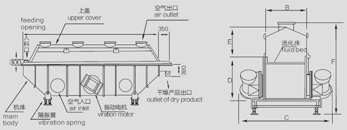 物料自进料口进入机内,在振动力作用下,物料沿水平面流化床抛掷,向前连续运动,热风向上穿过流化床同湿物料换热后, 湿空气经旋风分离器除尘后由排风口排出,干燥物料由排料口排出。